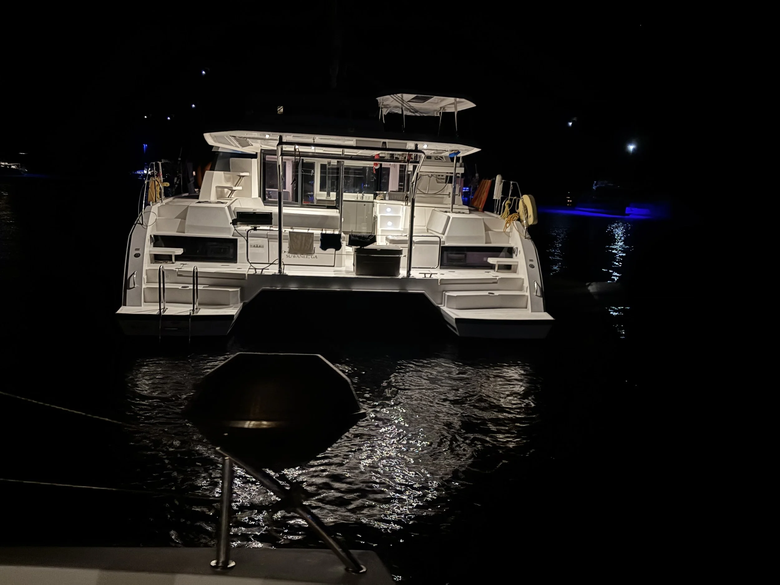 We have been cooking dinner onboard each night. We have charcoal grill that gets lots of use. We had steak the first night and chicken the second night. The galley is spacious. That is the beauty of a catamaran. Lots of living space.