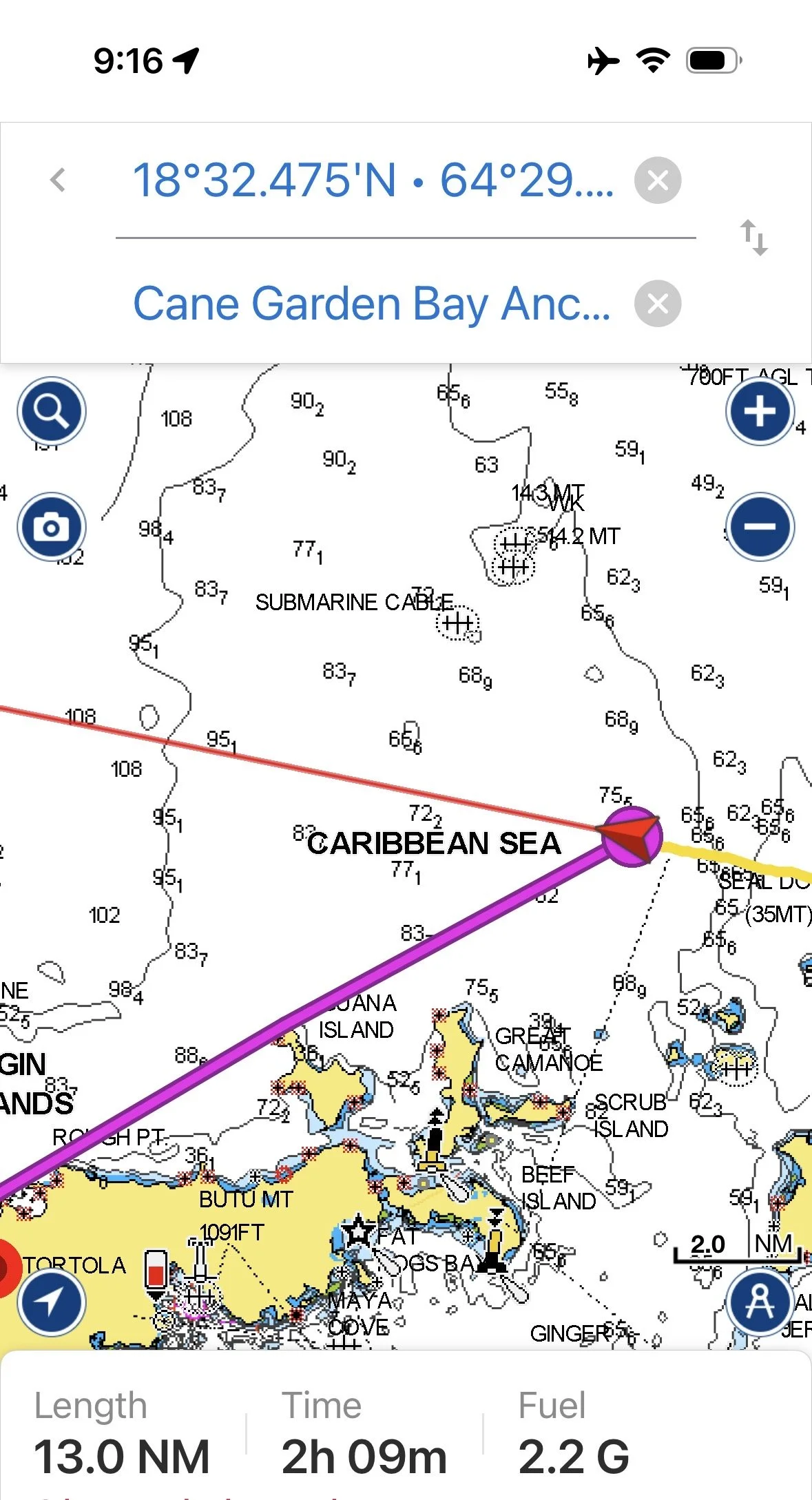 As I mentioned we do not always get wind from the right direction. The magenta line is the course to Cane Garden Bay. The thin orange line is our heading.