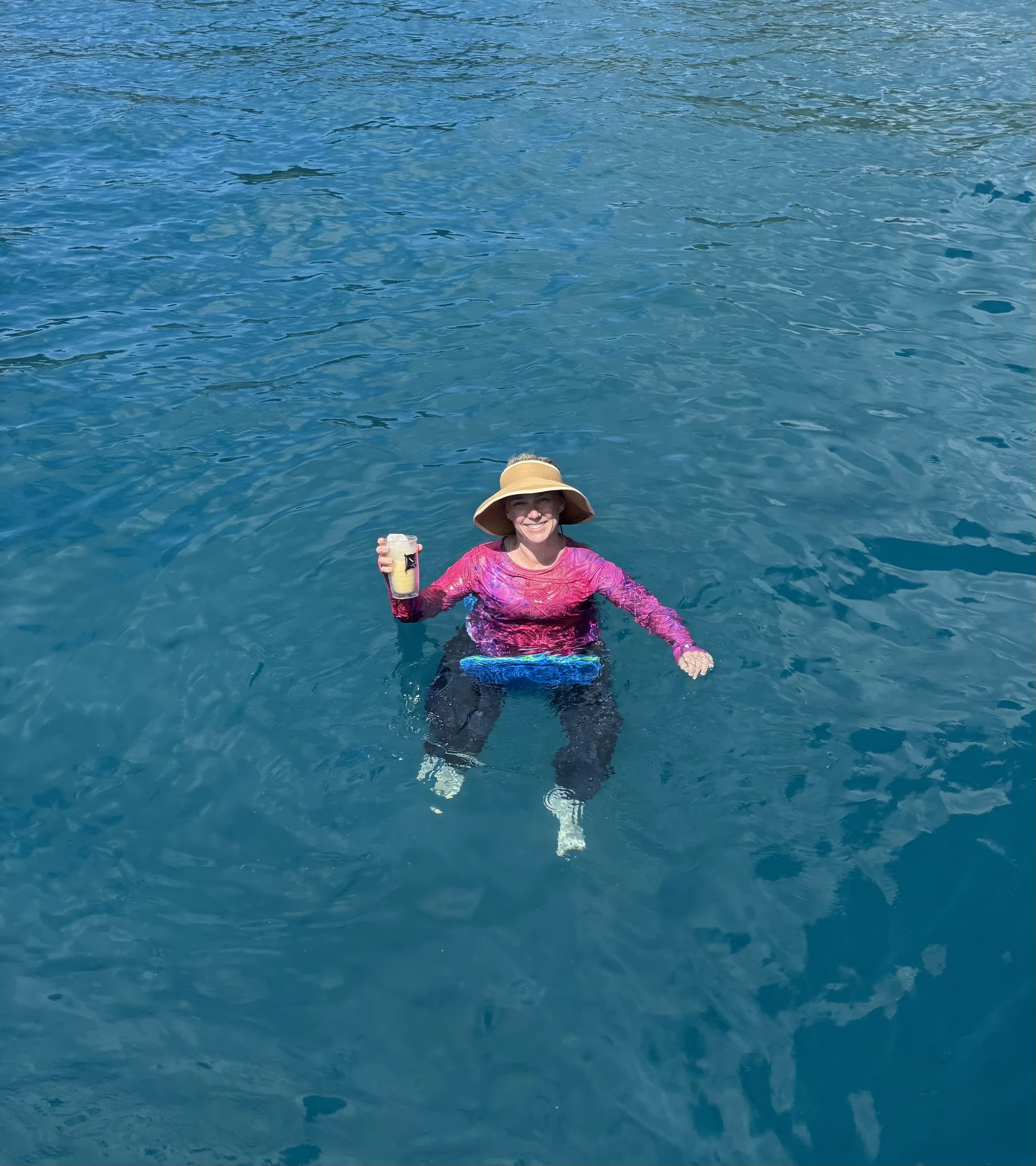 Alison enjoying a final swim off the stern of Jaxnjoe