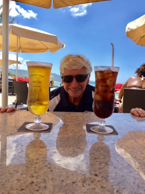 On Tuesday night, while tied to the mooring ball at the Montego Bay Yacht Club and Marina, the generator alarm went off. The batteries are fully charged but the smart system in the generator figured out it would not be able to start. In the morning Gabe and I read and reread the Yanmar trouble shooting guide. I found a burnt fuse and Gabe found a disconnected wire. We fixed them but the generator was still not getting any power. We searched for more fuses and circuit breakers to no avail. Gabe decided to leave Pilar at the Montego Bay Marina until April 7 and not move her to Port Antonio. He contacted a mechanic to repair the generator. The MBYC agreed to let Pilar stay at the dock while Gabe is away. We used a Mediterranean style mooring technique. We have a long line off the bow to the mooring ball, an anchor off our port bow and lots of spring lines tying the stern to the dock.The little white dot is our mooring ball.We now get on and off the boat using a plank. Aye, we must walk the plank matey.Tiesday was our farewell day for Angela. She flew out of Montego Bay to go back to Chicago. Gabe needed a lot of help getting Pilar tied to the dock so Priscilla and I were glad we were still here to help. The winds are honking out of the east so it would have been a spirited ride to windward to go to Ocho Rios and then on to Port Antonio. Some things just work out.Priscilla and I went for a tour of Montego Bay with our driver Leroy Simpson. He took us from the penthouse to the outhouse of neighborhoods. He was willing to drive through the ghettos during the day but not at night. There are many lovely homes on the hills with great ocean views.Leroy Simpson and CFJThe tech arrived around 3:00 pm to work on the generator. He worked tirelessly for four hours trying to trace the source of the problem. At last he had that eureka moment when he grabbed the main power cable to the starter and the fitting crumbled in his hand. Corrosion is insidious. Rust never sleeps. He will bring a new fitting tomorrow and we shall see if that is the solution.John and Priscilla had dinner at Margaritaville in Montego Bay. There is another Margaritaville in Negril. The cruise ships were departing so the restaurant was 99% empty. The staff was 100% high on fresh air and ganja. The odor of marijuana wafted ever so stronger as the waitstaff eventually approached. We had a spectacular view of the cruise ships as they departed Montego Bay for their next port of call. Perhaps they are cruising to the Cayman Islands or the Yucatan.Farewell cruise ship. Safe journey.On Wednesday we has the option to take a 3 hour round trip taxi ride to Ocho Rios or chill. We chose chill. There is a Hard Rock Cafe beach club less than a 10 minute walk from the marina. Priscilla and I spent a lovely afternoon at the Hard Rock. We had lunch, swam in the pool and swam in the sea. We rented two lounge chairs and an umbrella for $12.00.Priscilla's view at lunchKuhmar, the generator tech returned with the cable fitting. He installed the fitting and the generator sprang to life. Upon closer examination the water pump was leaking water all over the generator which may have contributed to the rapid corrosion on the power cable fitting. Gabe retrieved a new water pump from his vast inventory of spare parts. With the new water pump installed he let the generator run for two hours while we all had dinner at the marina. The meals were excellent as was the service. The wait staff at the marina are older and not accompanied by the whiff of a spliff when they approach the table.Our final night onboard Pilar was a quiet one. We packed our bags in preparation for our flight from Montego Bay airport to Miami on Thursday. Leroy will pick us up at 11:30 am for our 2:12 pm flight on American Airlines. It is nice that the taxi ride to the airport will be five miles and not the 100 miles from Port Antonio. We will have a 2 hour flight. Upon arrival in Miami we will require transportation to the Grove Isle Marina to retrieve our car. Perhaps Uber or Lyft will work or there may be a train or bus to get us closer. Hopefully our car was not towed away in the three weeks we have been gone. The marina has very limited parking so the Dockmaster Jorge recommended parking in the main lot for the condominium complex.On Thursday morning Leroy picked us up at the marina and drove us to the to the Montego Bay airport. Our flight arrived in Miami on time. I contacted Lyft for a ride to the Grove Isle marina. Our car had not been towed. We drove the 104 miles from Miami and Stuart arrived home at 8:30 pm.Priscilla and I are glad we could accompany Gabe and Angela on the first two legs of their four year circumnavigation. Bon voyage.βit is good to have an end to journey toward, but it is the journey that matters in the end.β