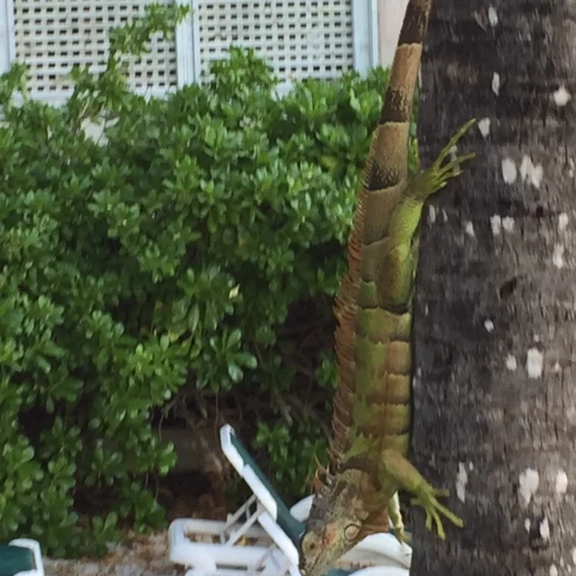 Which way to the beach?Dale and Andy will fly to Chicago on December 17 to visit family at Christmas for 10 days.Andy took this picture of an iguana poolside. It is three feet long.Cayo Hueso (Spanish pronunciation: [ˈkaʝo ˈweso]) is the original Spanish name for the island of Key West. Spanish-speaking people today also use the term when referring to Key West. It literally means "bone cay (a low island or reef)". It is said that the island was littered with the remains (bones) of prior native inhabitants, who used the isle as a communal graveyard. This island was the westernmost Key with a reliable supply of water.Changing Latitudes in her slip at the Galleon Marina in Key West.Bonus photo