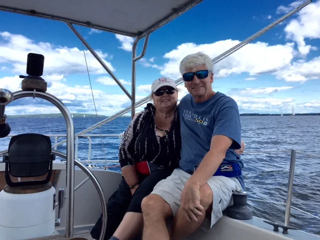 Miles cruised 0, fuel purchased $0, slip fee $36, daily high temperature 82°fWe are at the Pirates Cove Marina in Clay, NY which is near Syracuse. CL will be here until July 28. The blog postings will take a hiatus until we start heading to Canada on June 29 or so.We are the blue dot near the word New York. We are getting very close to the Great Lakes.We have bonded with Patty and Paul the owners of Pirates Cove Marina. They have been the owners for forty years and have great pride in ownership. Their restaurant and swimming pool are excellent. They also set up a mini trailer park for 4 motor homes in their parking lot. They make money every which way they can. True entrepreneurship.There are three sunken barges near the marina. Paul told us that a contractor from NYC brought a load of stones up the Erie Canal for a construction project many years ago. It was too expensive to haul the barges back to NYC empty so they were abandoned in front of the marina. Paul advised that a mysterious man with a chainsaw went aboard the barges and sunk them stategically to privide protection to the marina.I asked Paul how the name Pirates Cove was selected. He said in the 1950's and 1960's the marina was called Holiday Harbor. He didn't know where the name of the marina came from. The former owner is still alive so he said he would ask her.What is the best way to keep ducks off your swim platform? A rubber snake is the answer.Dale and Andy found a Lutheran church nearby for Sunday service. The marina has a courtesy car available. It looks like the best courtesy car we have seen on our trip.Sunday was sunny and the water in the swimming pool was warm. We swam for a few hours and hung around the boat playing the ukulele and packing to visit Dick and Candy Smith on Monday. Enterprise car rental will pick us up at 11:00 am.On Monday the Enterprise rep arrived early and we started our 4.5 hour drive from Syracuse to Plattsburgh. We took the scenic route through the Adirondack Mountains. We had a few rain showers along the way and arrived in Plattsburgh at 5:00 pm. Dick and Candy Smith have a lovely cottage overlooking Treadwell Bay on Lake Champlain. The cottage has been in the Smith family for 60 years.The view from the Smith's cottage. A wide water view.On Tuesday we went sailing on Dick and Candy's Stellar 30 named Odyssey. There was a brisk breeze on the lake. We sailed for several hours and brought along some McDonald's lobster rolls for lunch. They were delicious. It was nice to be sailing again. Moving across the water quietly and not burning a gallon of diesel fuel per mile was a treat. After the completion of the Loop trip we will sell CL and John and Priscilla will once again sail their Pearson 39' sailboat Blue Heaven out of Waukegan Harbor.OdesseyDick and Candy SmithJohn and Priscilla enjoying a day of sailing onboard Odyssey on Lake Champlain.Carl (Chef) Wooden - quote of the day.“The Ancient Mariner would not have taken so well if it had been called The Old Sailor.” Samuel ButlerSamuel Butler (4 December 1835 – 18 June 1902) was an iconoclastic Victorian-era English author who published a variety of works. Two of his most famous pieces are the Utopian satire Erewhon and a semi-autobiographical novel published posthumously, The Way of All Flesh. He is also known for examining Christian orthodoxy, substantive studies of evolutionary thought, studies of Italian art, and works of literary history and criticism. Butler made prose translations of the Iliad and Odyssey, which remain in use to this day.