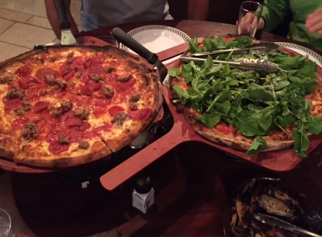 Saturday night brought the Weber Yachts team together onboard CL for docktails. Rich Reick’s wife Karen joined us. Karen has been with IBM for 32 years. We decided to go to dinner at the marina restaurant called Rendezvous but a virtual yacht club is having their monthly gathering at Marina Bay resulting in a 1.5 hour wait. We hopped in our cars and went to a wood fired pizza restaurant and enjoyed a great meal. We had the ultimate dichotomy in pizza selections. One pizza was sausage and pepperoni and the other was cheese and arugula.