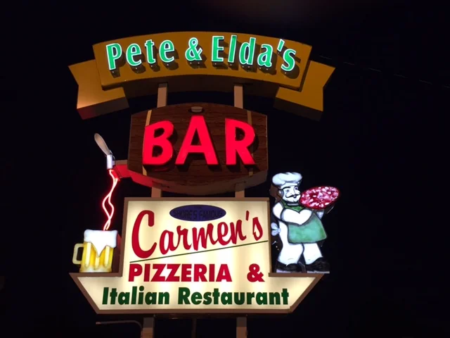 We shared four extra large pizzas between 8 of us. If you can eat an extra large pizza by yourself you get a coveted Carmen’s Pizzeria T-shirt. George has at least one Carmen’s T-shirt