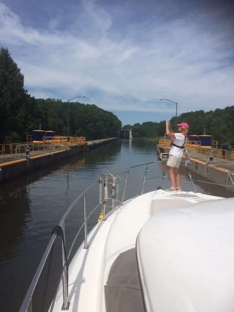 We spent two nights in Waterford, NY and cast off at 10:00 am on Tuesday for Amsterdam. We proceeded to enter the lift of five successive locks at the east entrance to the Erie Canal. We purchased our 10 day canal transit pass for $50 and were lifted 169′ in less then a mile. As you exit one lock you enter the next one. In total we transited 9 locks in one day. This is a new record for us. We might be able to beat this record when we transit the Trent Severn Canal in Canada. Photo by Priscilla.