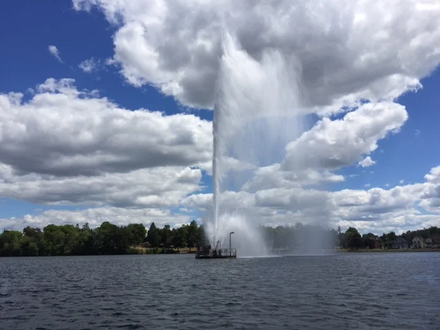 There is a fountain in the Peterborough harbor that shoots water 100′ in the air. At night it is illuminated and glows red and purple. I was wondering if the lights kept time to music being played by the band but the light pulsing appeared to be random.