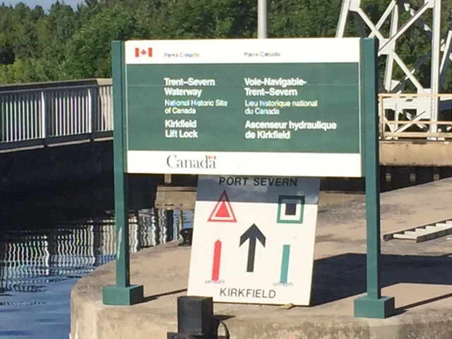 On Monday morning we let the black houseboat lock through first. It is always best to lock through alone if you can. We locked through the Kirkfield lift lock alone and were able to get great photos with us in the front of the 49′ drop. Where else can you be on your boat and be suspended five stories in the air.