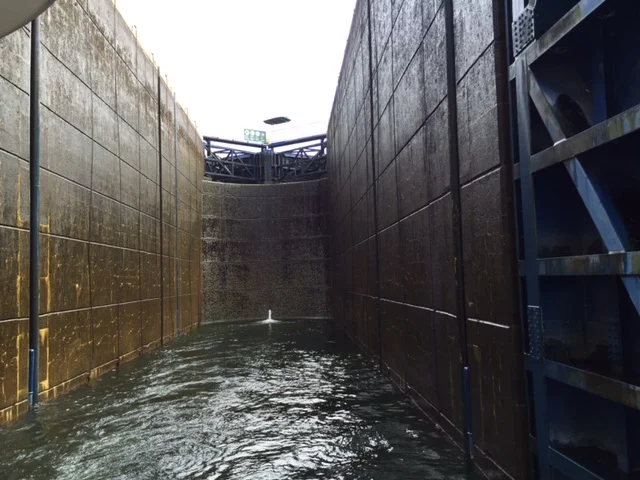 We were underway at 10:00 am and headed north on Couchining Lake. We passed two swing bridges and locked down 22′ then locked down 45′. The lock #43 is the tallest standard lock on the Trent.