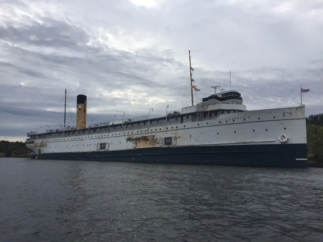 SS Keewatin is a passenger liner that once sailed between Port Arthur / Fort William (now Thunder Bay) on Lake Superior and Port McNicoll on Georgian Bay (Lake Huron) in Ontario, Canada. She carried passengers between these ports for the Canadian Pacific Railway’s Great Lakes steamship service. Keewatin also carried packaged freight goods for the railway at these ports. She was launched on July 6, 1907 and is 336′ long. Now it is a floating steamship museum. (The side of the ship facing shore is nicely painted.)