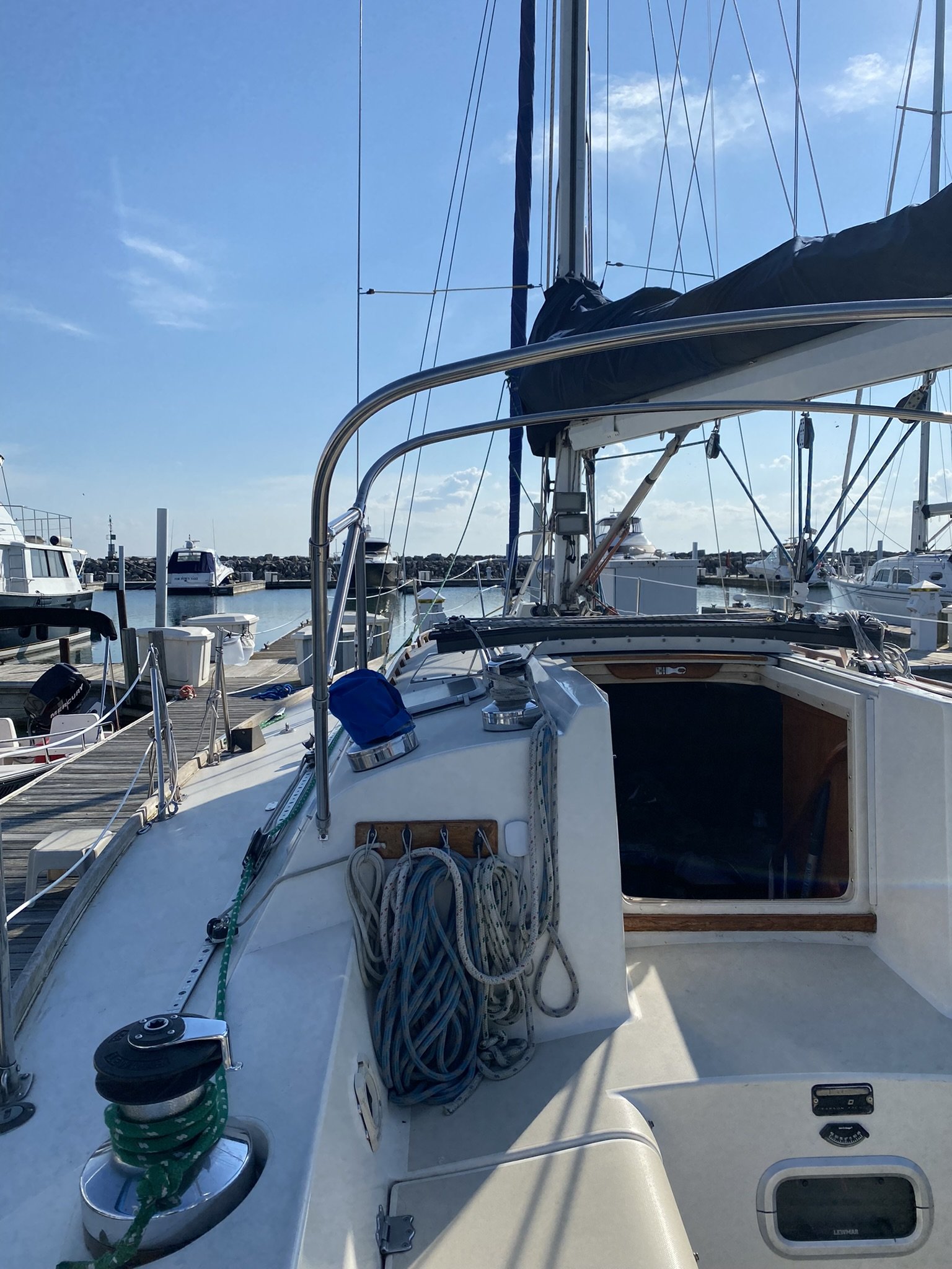 It is a dark and blowy night. The tight rigging is singing and the dock lines are straining. They make a groaning and stretching sound. We are in a protected harbor and our boat is laying over 10°. Blue Heaven is on the lee side of the dock which is a good thing. We are not grinding on our fenders. Tonight is our second night in Winthrop Harbor. We are attending the annual Weber Yachts rendezvous. Priscilla and I have not spent a night onboard our sailboat since before our Great Loop adventure of 2015/2016. I guess a full year living on a boat is enough for a while. We did sail her to a Weber Yachts rendezvous in 2019 in Racine but we moved on board Bob Dick’s luxury yacht and made our boat available to the Weber Yachts photographer and some other guy. Bob’s wife Joy had recently passed away and this was his first and last cruise on his boat without her. We watched the movie Master and Commander with him on his boat.