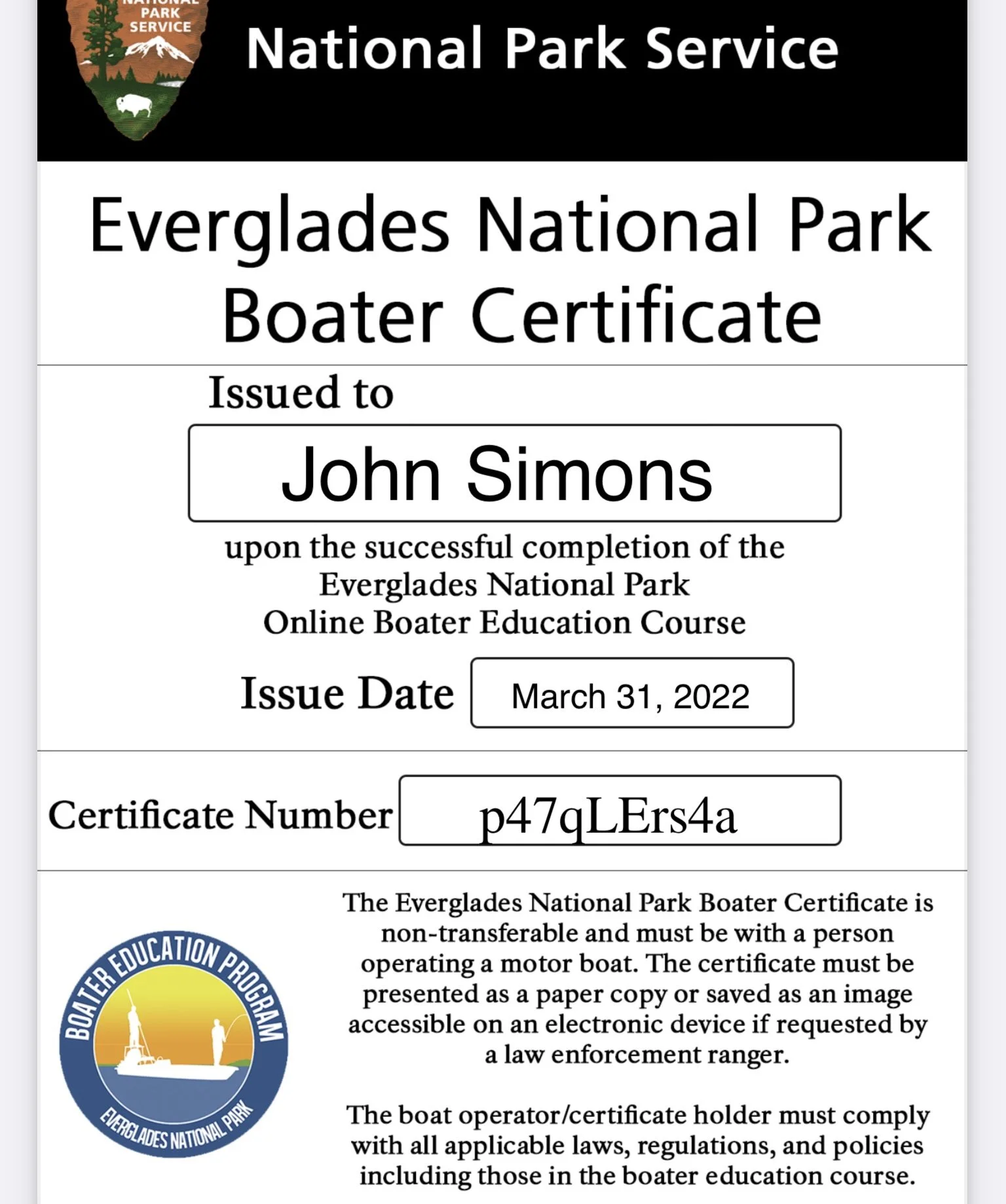 2. I must take and pass a one hour on-line tutorial on boating etiquette in the Florida Everglades. Yes, I passed.