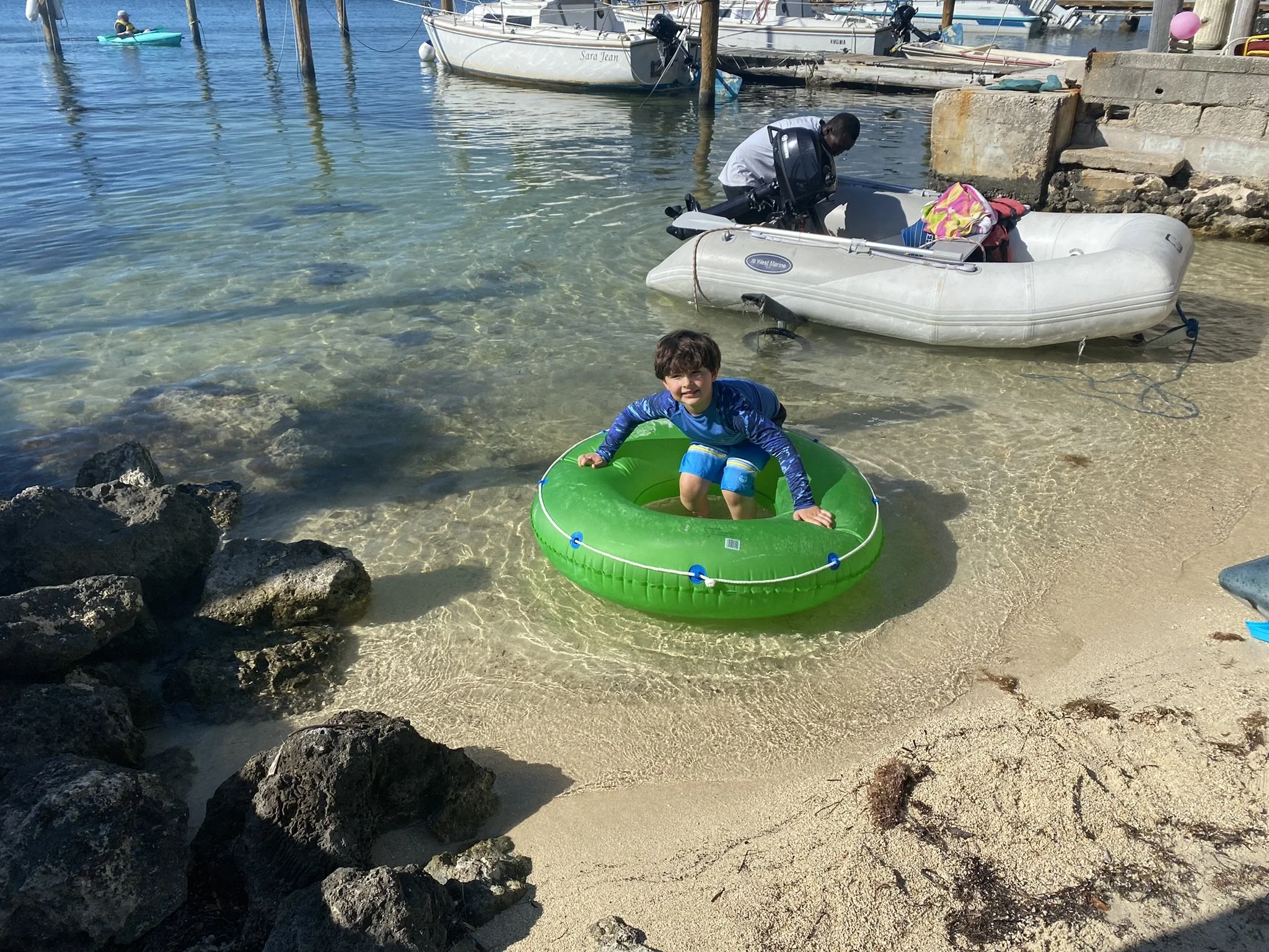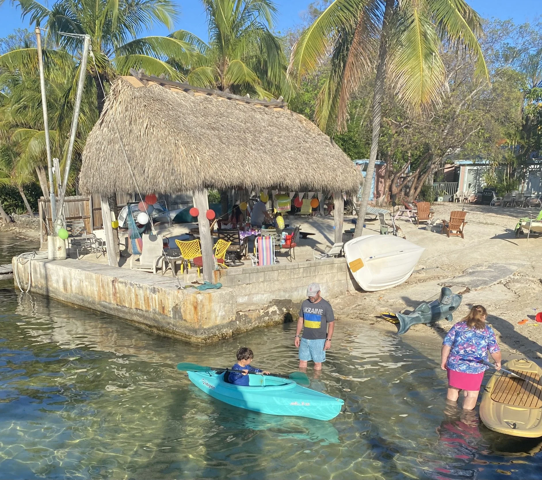 Whoa! What did we get ourselves into? This place looks like an abandoned trailer park. I hope a murderer in a clown mask doesn’t jump out and try to kill us. That was our first impression of the Key Lime Sailing Club. Fortunately first impressions can be wrong. We were greeted by a lovely person who was very helpful in getting us registered and showed us to our cabin. It is an eclectic layout with a double bed raised up on two steps and a single bed in a hallway and a pullout sofa. There is a combination sink and two burner stove and a mini fridge. At first it seemed like camping but it is a little more comfortable than that. We unloaded the car of all our stuff into the cabin and headed to the beach. At this moment the genius of our decision became clear. A short walk to the gulf revealed a paradise. There were docks with sailboats tied up. The beach was white sand with crystal clear water and the toys were everywhere. There was a sunfish sailboat, a catamaran, four Catalina 22s, many kayaks, canoes, paddle boards and beach toys. Everything is included with the cabin rental. My grandson Jackson could not wait to get to the beach. His first stop was the tire swing. “Life is just a tire swing.” But then he saw two other kids ages 5 and 6 playing on the beach. Instant friendship. The 6 year old girl was having her birthday party in the tiki hut on the beach and Jack and the other boy were invited. After the party Jack paddled around in a kayak and on a paddle board. In between he swam and then snorkeled in the crystal clear water.,