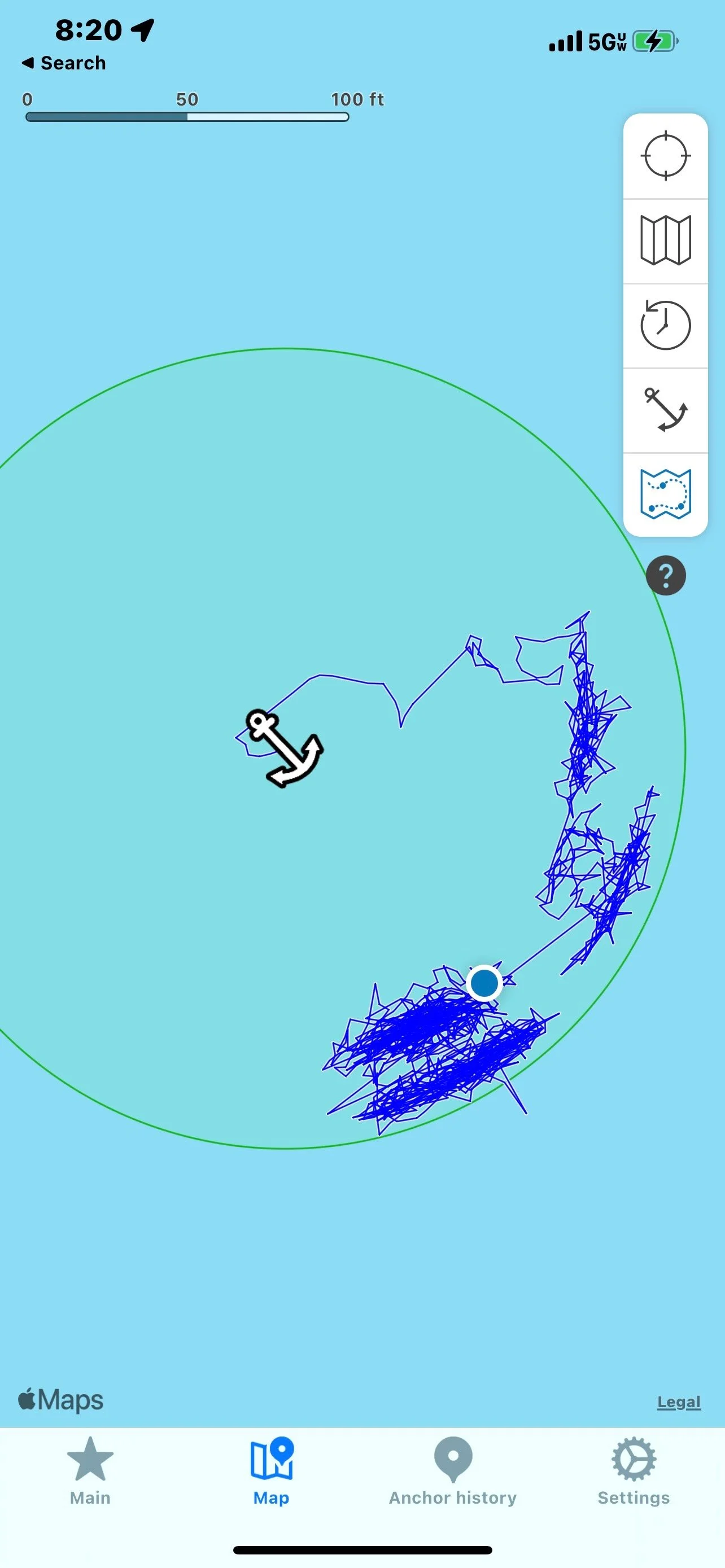 This is a screen shot of our anchor alarm. This app tracks the location of our boat while at anchor. You can see the wind shifted north and we bounced around a bit. However the anchor did not drag outside the zone.