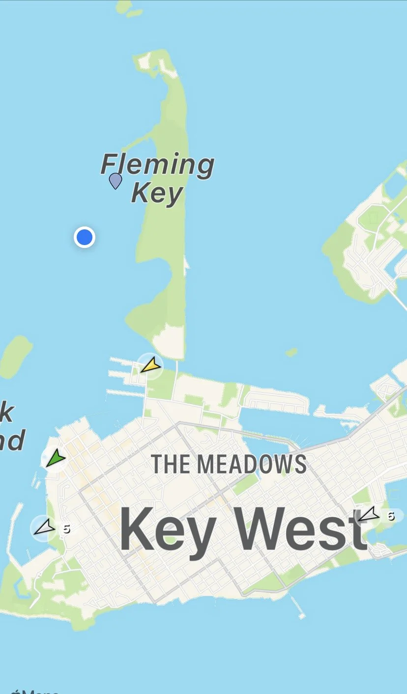 Here is a screen shot of our location in the Fleming Key mooring field called Man O War Harbor. We are the blue dot. There are several mooring fields in Key West but this one has the best holding and good protection from the wind and waves. Some heavy weather is coming on Friday night so we will go to the Stock Island marina for a few days until it blows over.