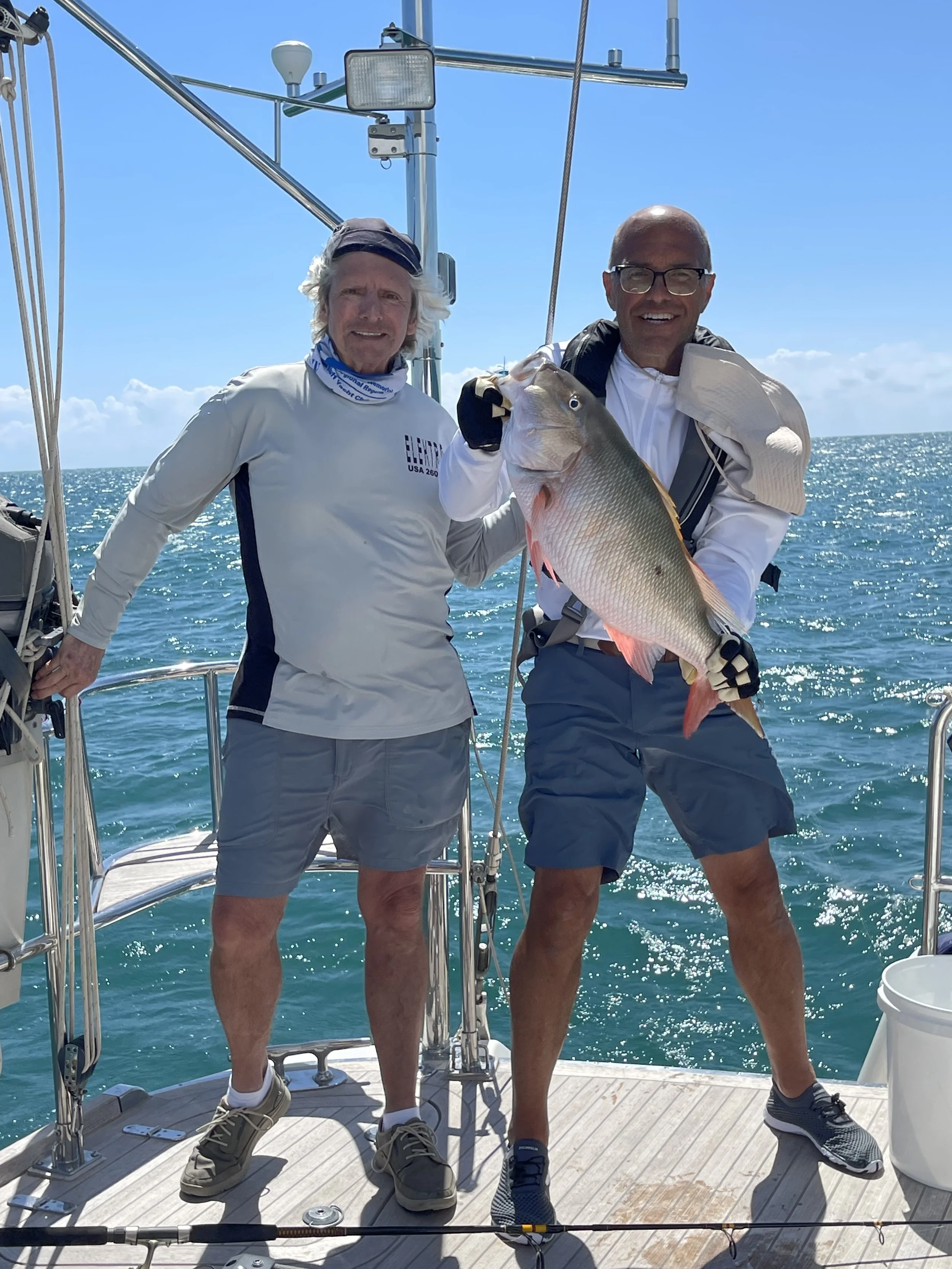 Our sail from Boot Key (Marathon Key) to Key West was one the best sails I have experienced. The wind was blowing briskly on our starboard quarter. We were well balanced with a full mainsail and half genoa jib. The waves were minimal and we were seeing 9’s and 10’s on the gps. We were nicely making way and transited the 48 miles from Boot Key to Key West in 6.5 hours including our stop to reel in the mutton snapper. That is a very fast ride. When we arrived in Key West we rolled up the jib and rolled the up the mainsail into the mast. Bistari has a mast furling main. It was a steep learning curve to furl the main without jamming it in the slot on the mast. That results in having to be hauled up the mast in a bosun chair and pull the mainsail out of the slot inch by inch with a pair of vice grips. This did happen previously but on this cruise we successfully deployed and furled the mainsail without incident every time. That is a successful shake down cruise. We think the secret to success is tacking the mainsail so the wind hits the sail from the port side and lines it up with slot before we roll it in. So far that has worked perfectly. Lynn is on the helm and Ken pushes the buttons on the electric winches.