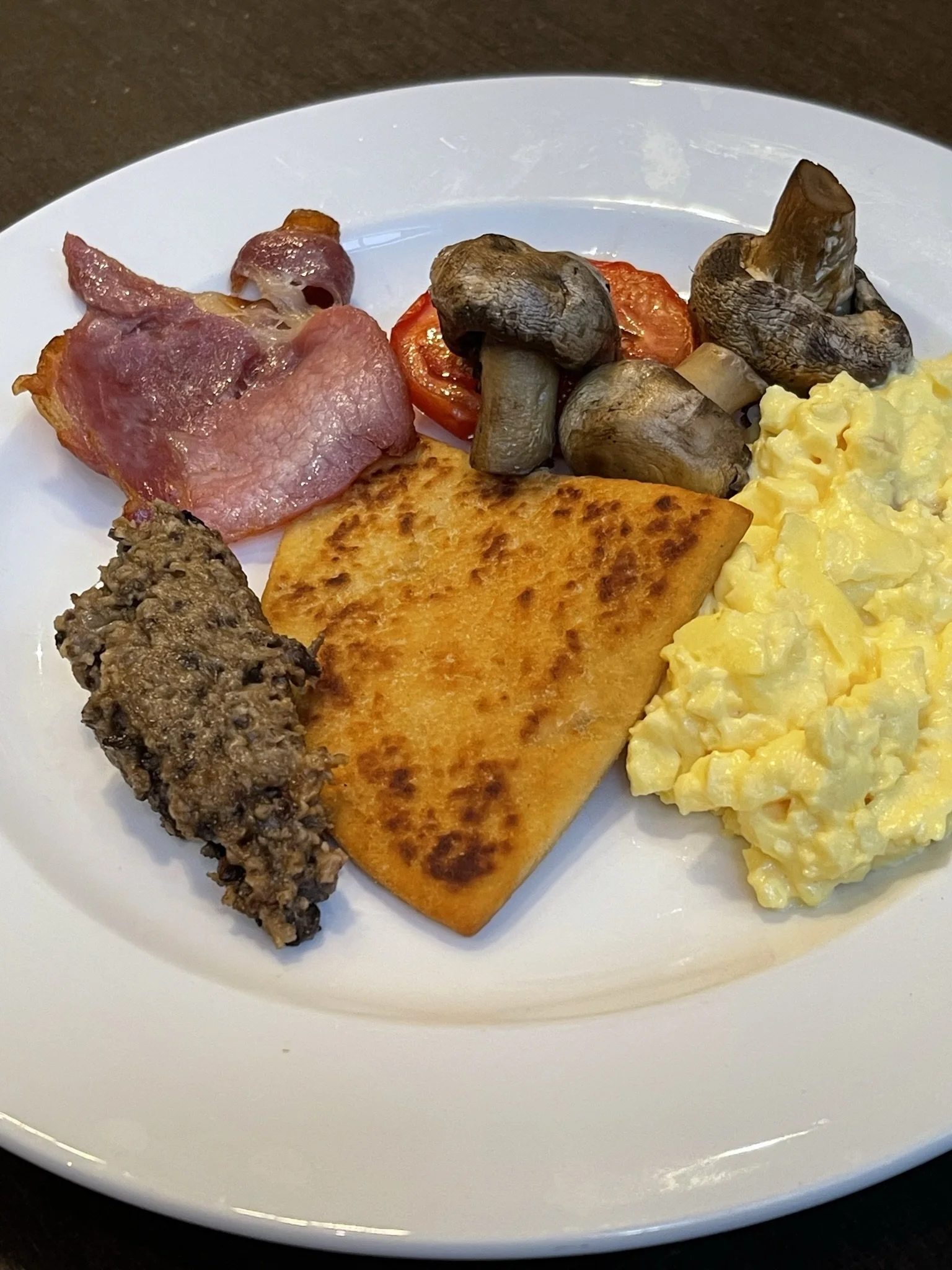 The haggis is the brown substance in the lower left corner. It tastes a bit like spicy hash. I have been to restaurants in Asia that specialized in animal organs. It is considered a delicacy. The photo was taken by Mary.