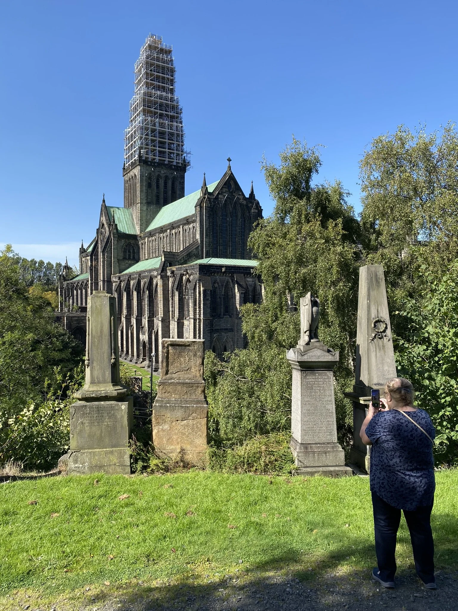 Priscilla and I exited the bus at stop #2 the Necropolis. The Necropolis is a Victorian garden cemetery built on a hill overlooking Glasgow Cathedral. It is the final resting place for over 50,000 souls.