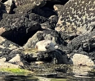 Nearby we visited a small island with numerous harbor seals lounging around. There was a small land bridge from the island to the shore. A baby lamb was bleating loudly to its mother. The mother was on the mainland but the water was now too deep for the baby to cross. The baby lamb would have to stay on the island for six hours until the tide goes out.