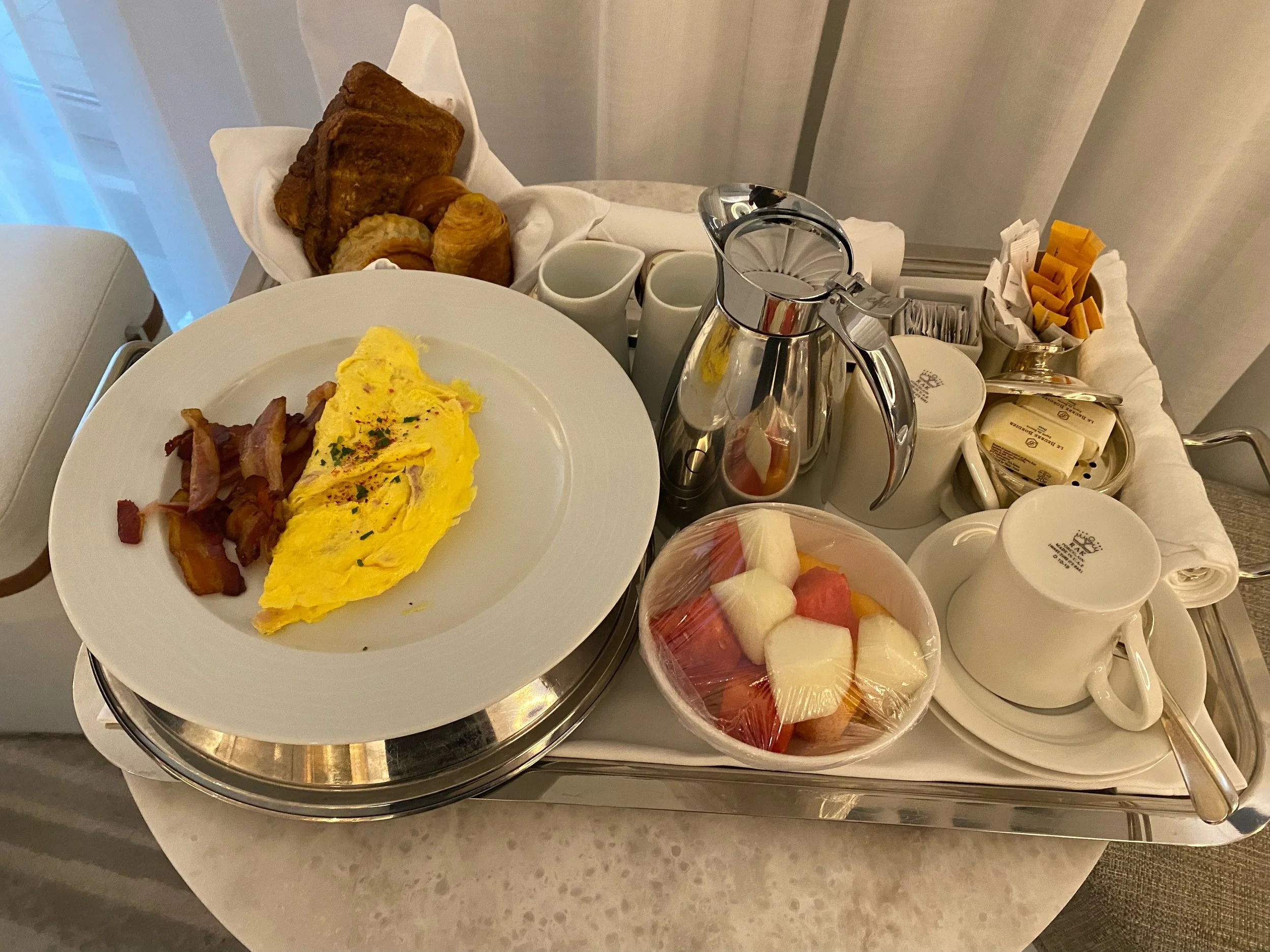We order room service for breakfast everyday. It is an extensive menu except no baked beans. On previous cruises I would get up early to forage around the ship for coffee, 2% milk, sugar and pastries. Then I would use my best balancing skills to get everything back to the room without spilling and dropping everything. The final step was to put everything on the hallway floor in order to open the door to our cabin and then make my delivery. Ah, room service, it’s the best.