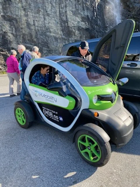 All of the rental cars in Geiranger are electric vehicles. The most popular are the two seat version. The seats are inline like a motorcycle.