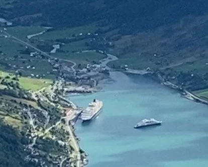 We were in the lifeboat turned dingy by 9:00 am and then on to our bus in Geiranger, Norway. This will be a day of broad vistas. We are fortunate to have the sunniest day of our trip. If this was a rainy day our sight-seeing would have been ruined. Our ship will hoist anchor and meet us at Hellesylt. Some passengers will stay on the ship for the cruise to Hellesylt. Our bus zig zagged up the mountain with numerous switch back turns. At one point cows blocked the road. Near the top of the mountain we stopped to look down on our ship anchored in the Geirangerfjord. Our small ship looks like the tender for the larger cruise ship. This was also a stop to see the Seven Sisters waterfalls.