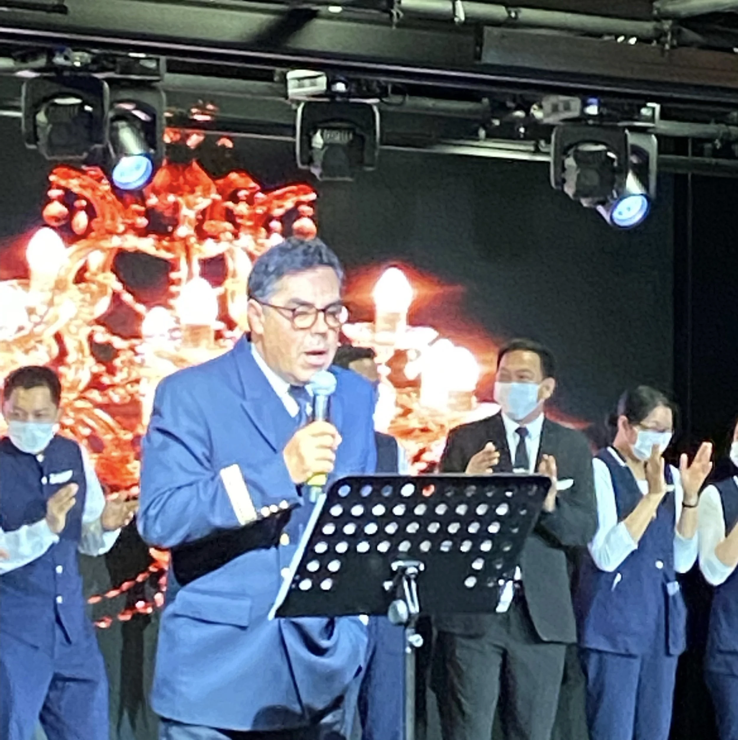 Captain Regis introducing his crew at the farewell event in the theatre.