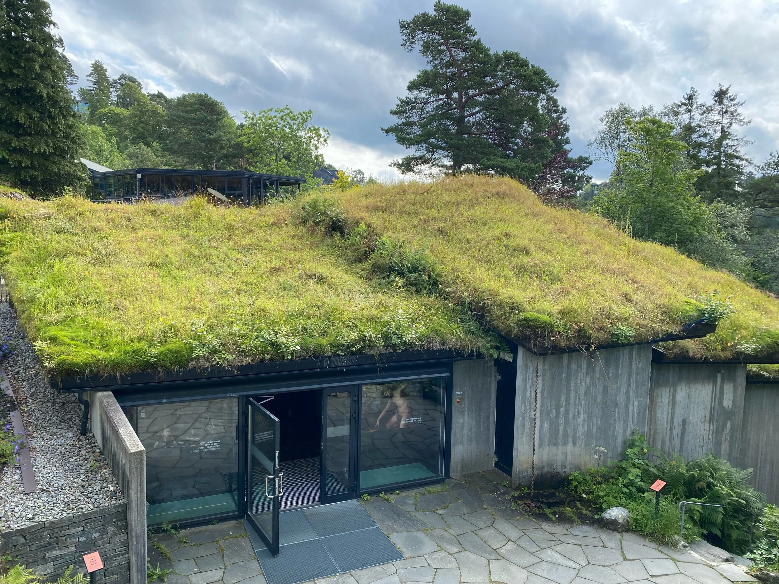 The music hall at the Edvard Grieg museum has a traditional grass roof. There are many grass roofs in Norway. The tradition is traced back to the Vikings.