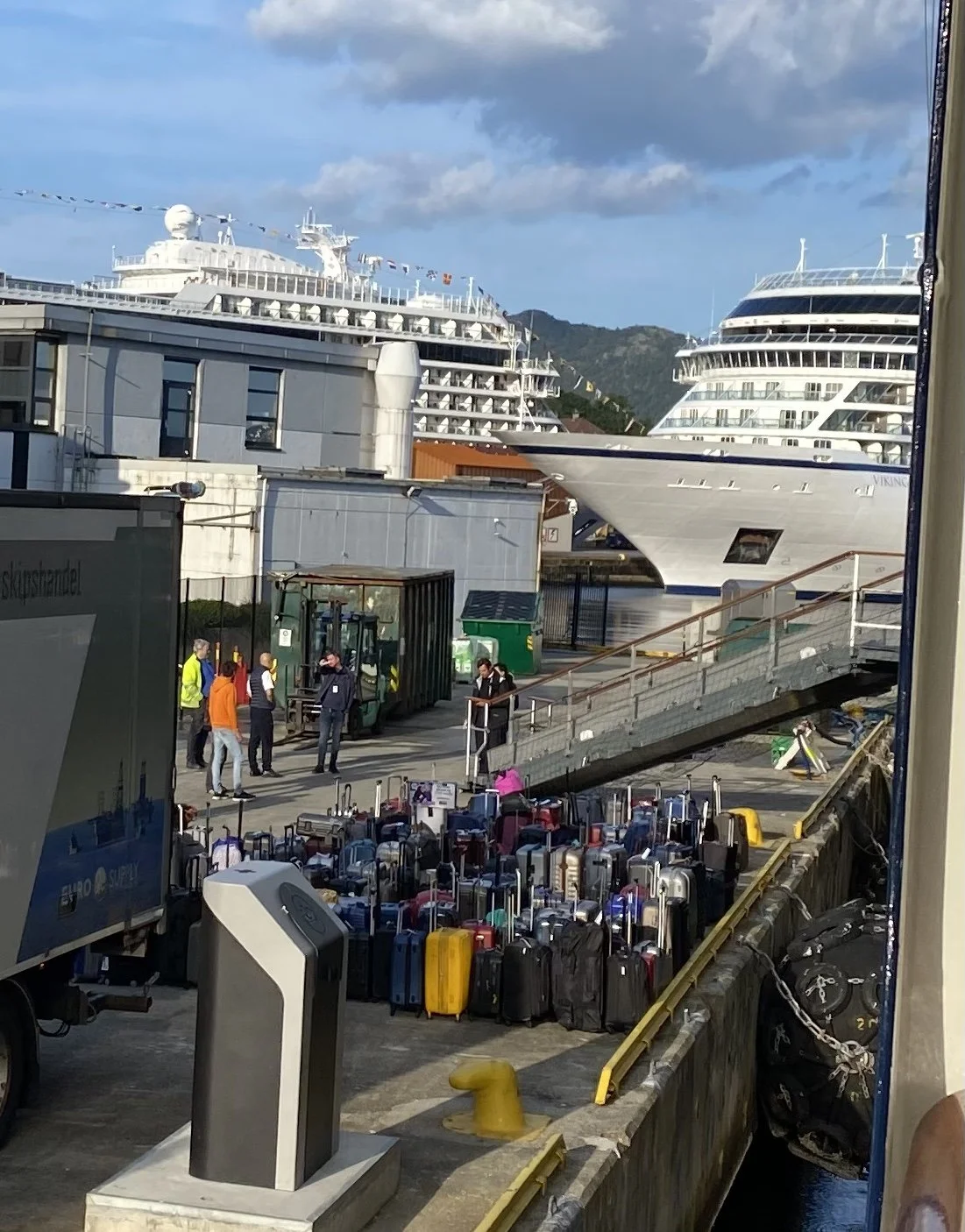We were on our bus at 8;15 am and heading off for our tour of Bergen. We passed by a pile of luggage being off loaded from the ship.