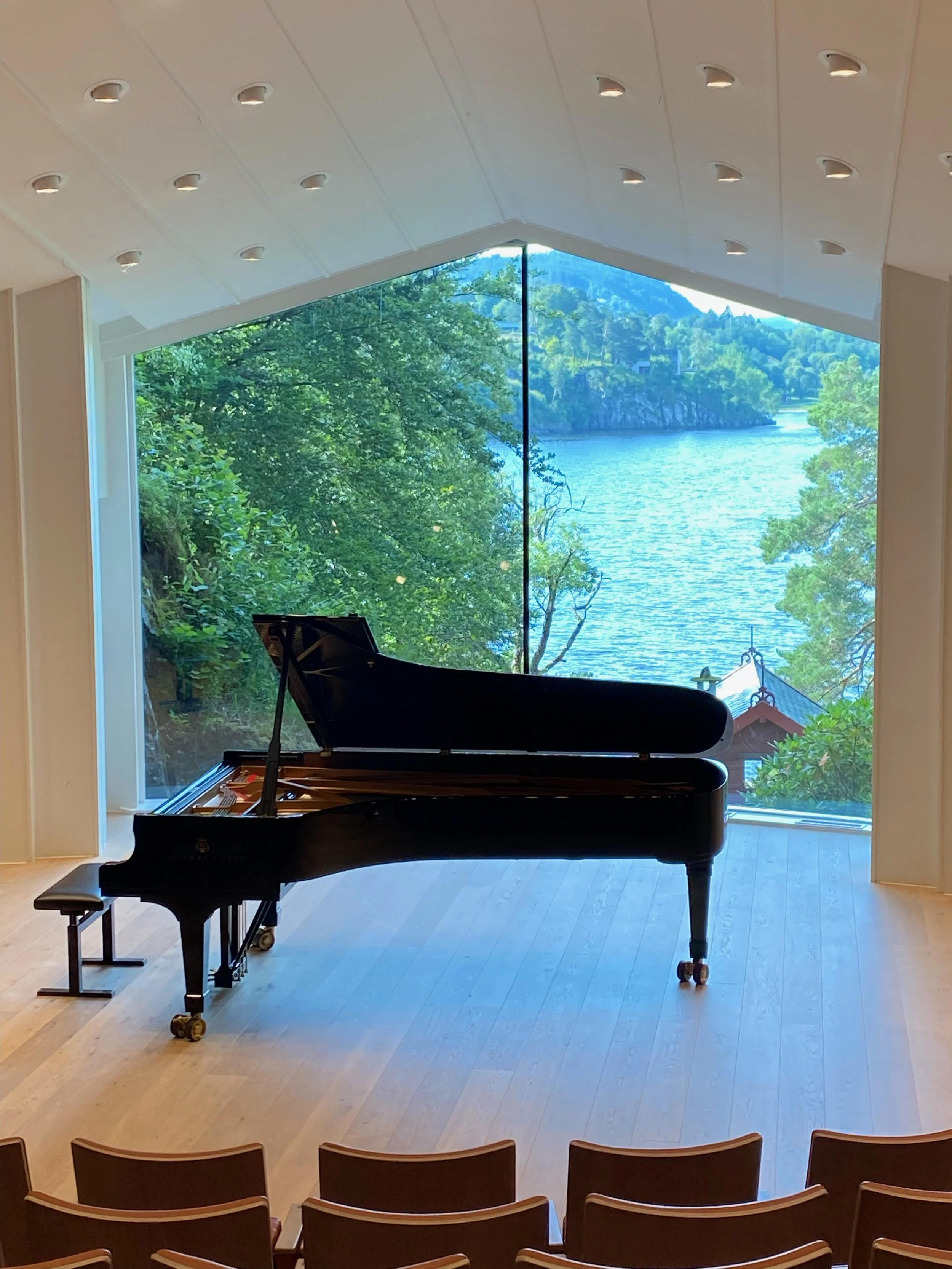 This is the stage in the concert hall in the Grieg museum. The back wall is glass and looks out on the fjord.