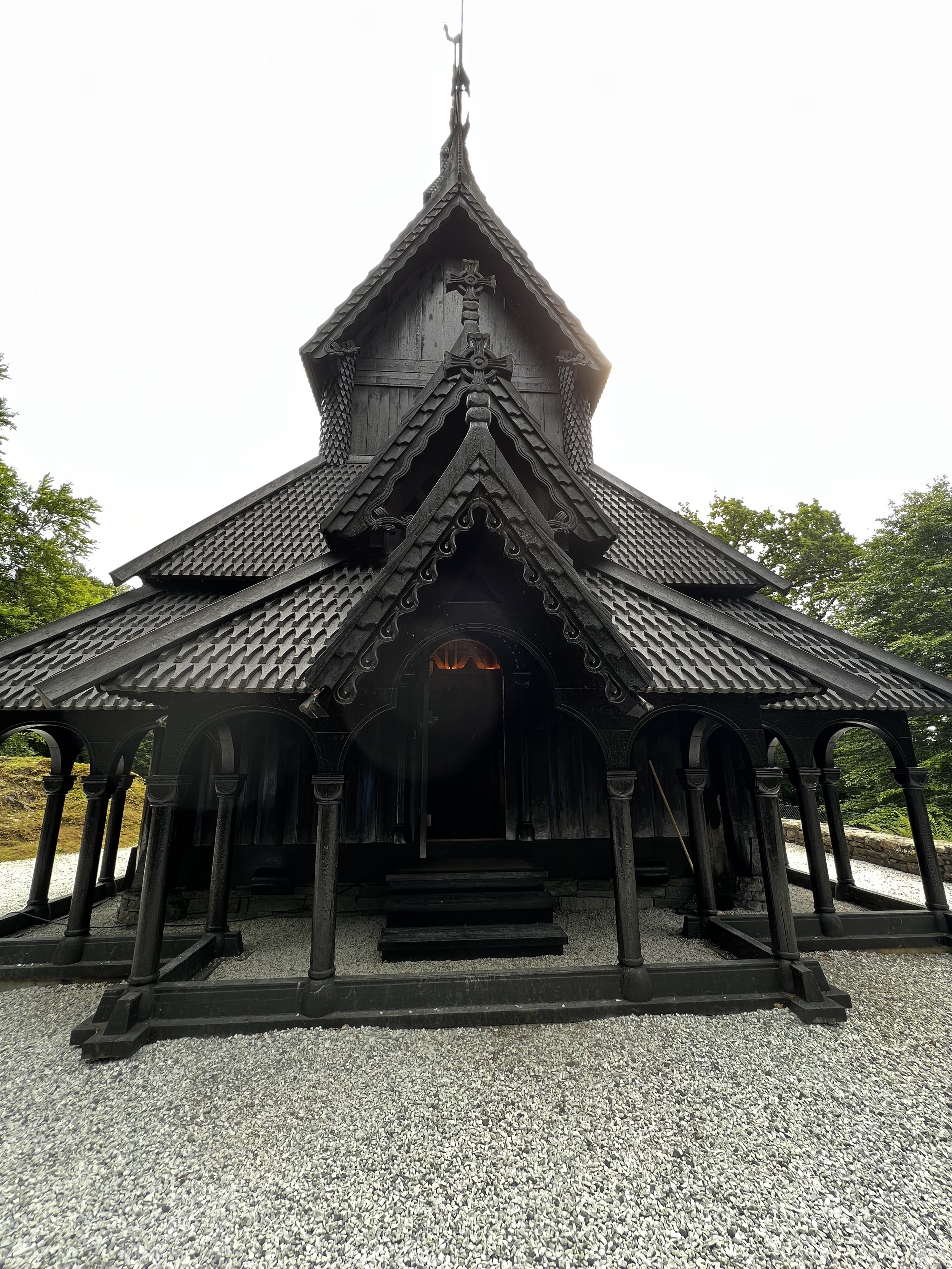 Our next stop was a visit to the Fantoff old stave church. There are only 26 of these historic wooden churches remaining in Norway. They are 72’ long and the roof is constructed from the upside down design of a Viking ship. This one was built in 1150 and was burned by satanists in 1992. It was completely rebuilt to its original specifications. At some point the government decreed that all churches must be large enough to hold half the population of the town. That was the end of 72’ churches.